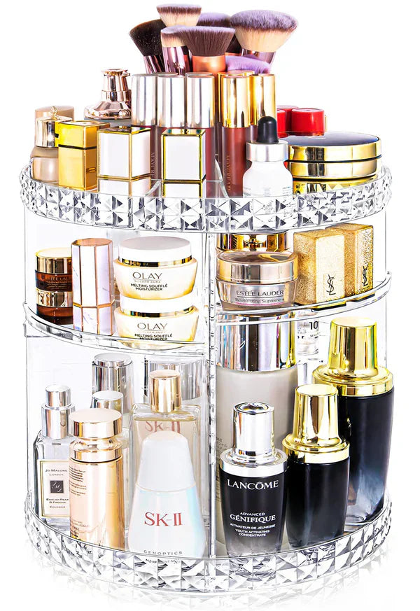 • 360 Degree Rotating Cosmetic Storage, crystal design shelf for makeup and other products.